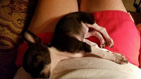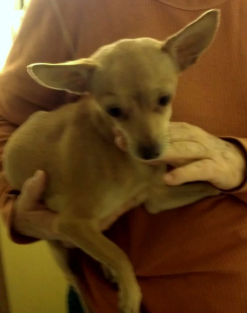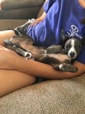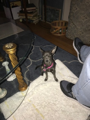 Here is the 4-5 lb. Queen in all her glory, Kiki. She is a cutie, and just has such an attitude while curling that tail tight. Kiki is a smart Chihuahua. She knows sit, sit pretty (begging sit), down, stay, here and rollover.